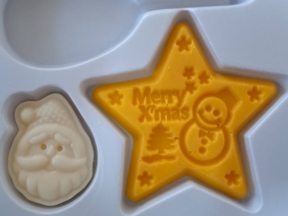 2024年12月24日 上面と側面に生クリームとチョコクリームを塗り、中央に「Merry Xmas」と書かれた星型のチョコレートを置き、周りにサンタクロース型のチョコレート、クリスマスツリー、ハート型と星型のろうそく、柊(2個)、5色のろうそくを立て、隙間に生クリームとチョコクリームの山を作りました。中には、生クリームとチョコクリームをサンド。 星型とサンタクロース型のチョコレートは、過去にも使ったことがありましたが、今回は単色だったため、←の写真では見えにくいかもしれないので、写真をもう1枚アップしておきます。 |