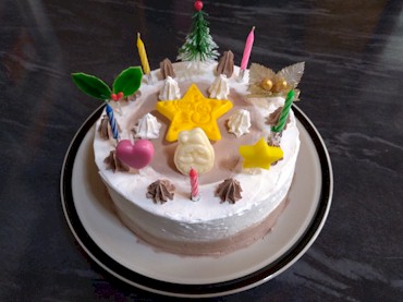 2021年12月23日 上面・側面に生クリームを塗り、上面中央に「Merry Xmas」と書かれた星型のチョコレートを置き、周りに5色のろうそくを立て、輪切りにしたバナナを置き、その上にクリームの山を作り、サンタクロース型のチョコレート、クリスマスツリー、柊で飾りました。中には、いちごジャムをサンドし、スポンジにメープルシロップを浸透させました。 なかなか良いアイデアが思いつかなかったので、前作で忘れていたいちごジャムとメープルシロップを使いました。 |